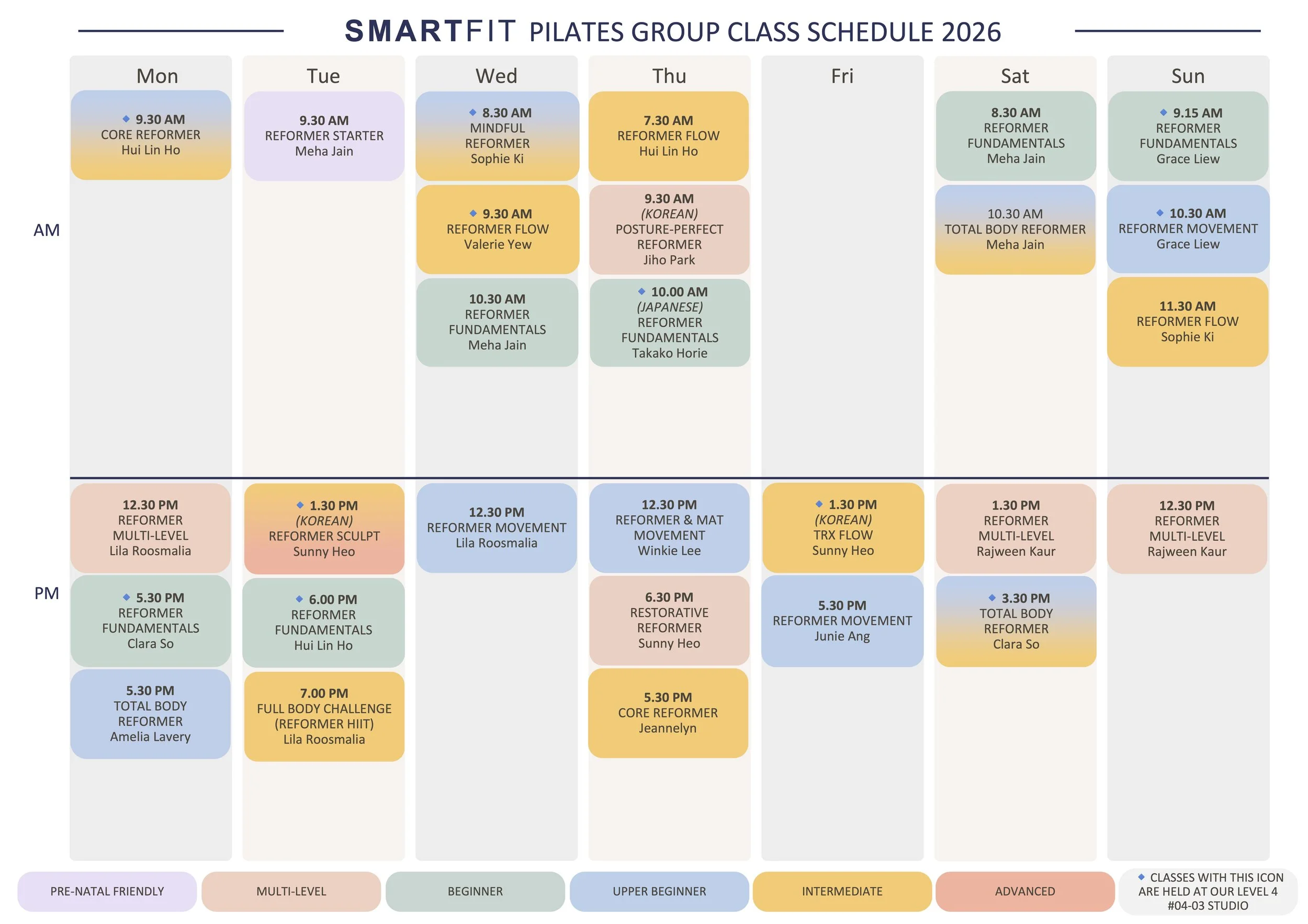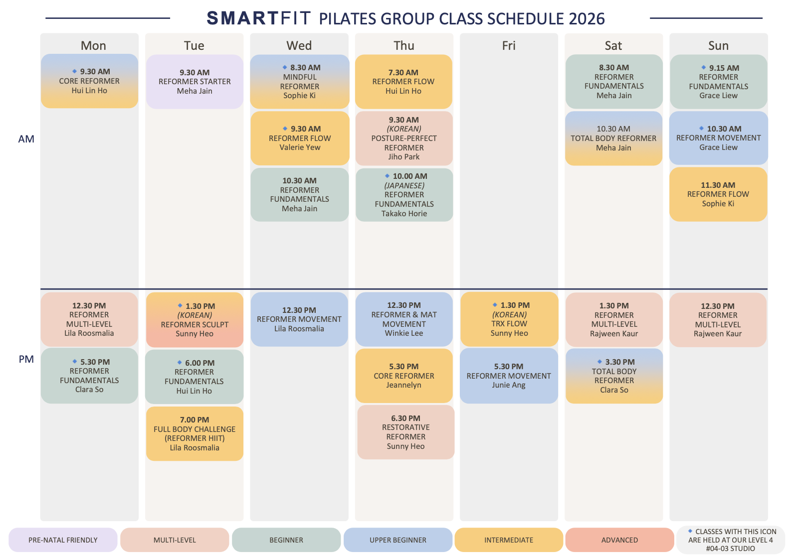 Level: 2/3 (moderate pace) Suitable for clients who have taken at least 20 lessons on the Reformer. Not for beginners.
